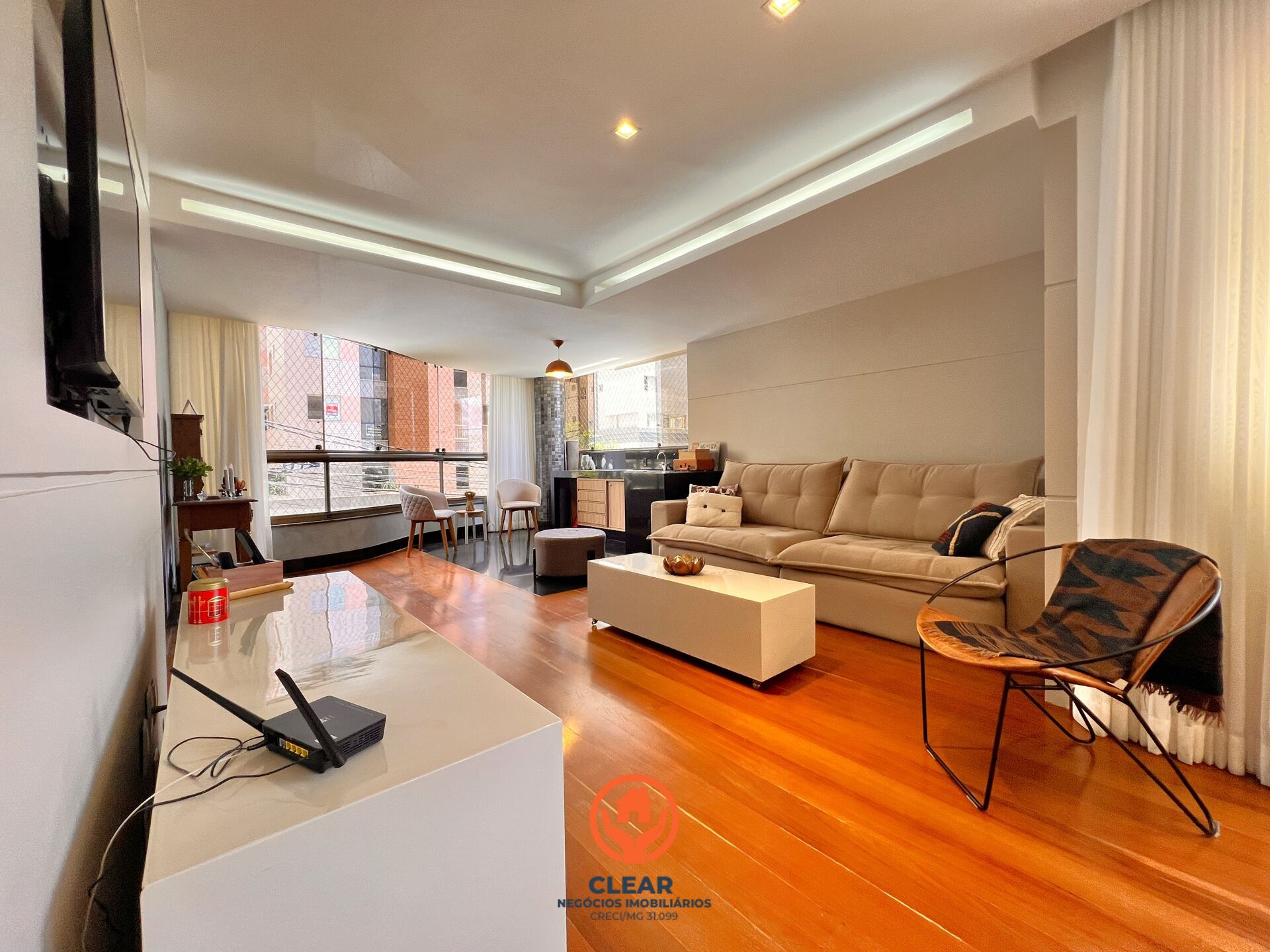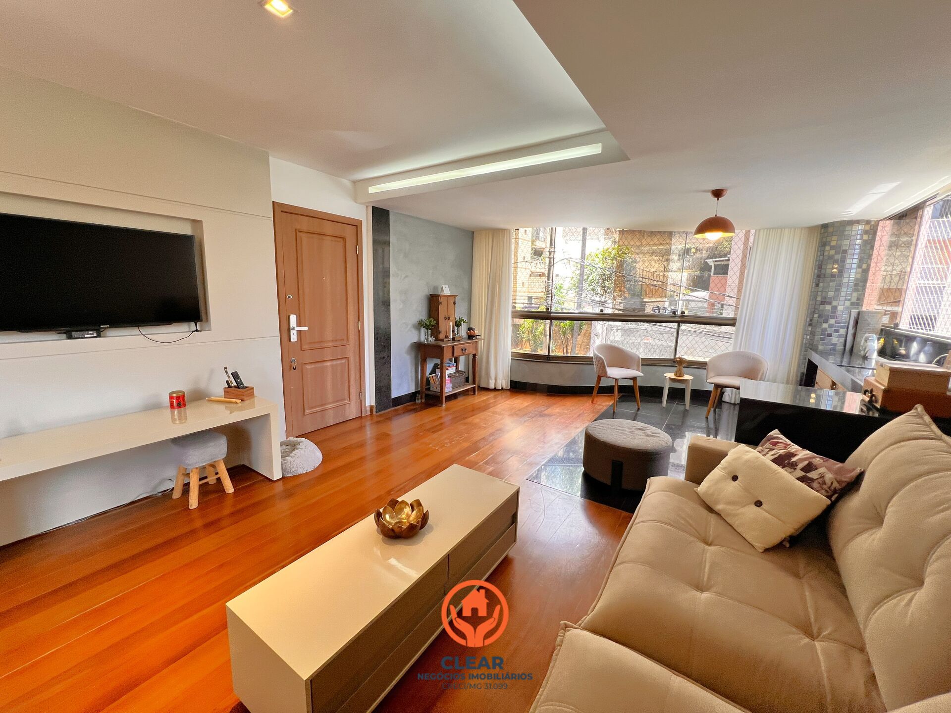 A sala possui espaço para vários ambientes, proporcionando conforto e integração entre os espaços sociais.
