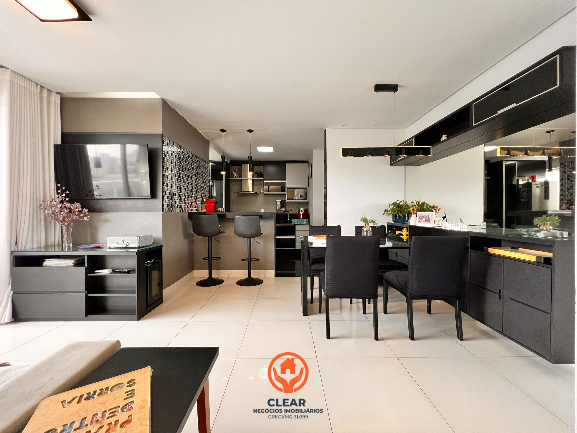 A sala é ampla para dois ambientes, com sala de jantar e sala de TV mobiliadas, integradas à varanda gourmet, equipada com bancada em granito, grill, mesa, banco alemão e pendentes, perfeita para receber.